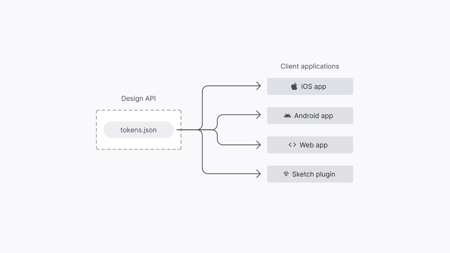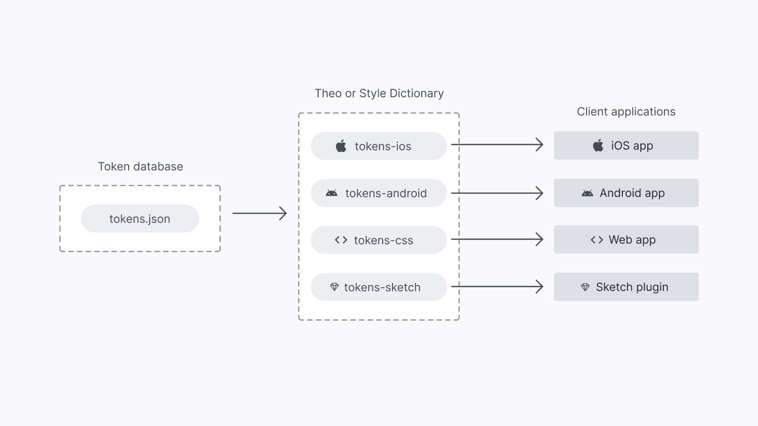 A package generated by Theo contains many copies of each design token, pre-formatted for each platform and format the end users need. When a new use case emerges, a whole new package needs to be compiled and distributed. As users’ needs grow, so does the package size. This is a many-to-many model: many tokens, many use cases.