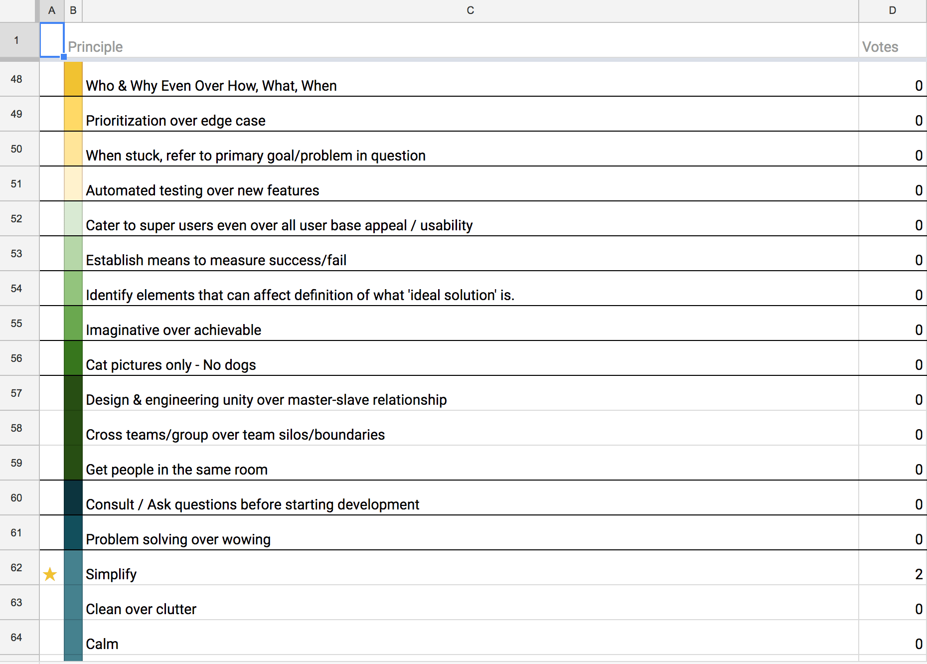 In the case of the Wall Street Journal Editorial Tools team, I (the facilitator) translated the principles into a spreadsheet, themed them by color, and highlighted the principles with the most votes.